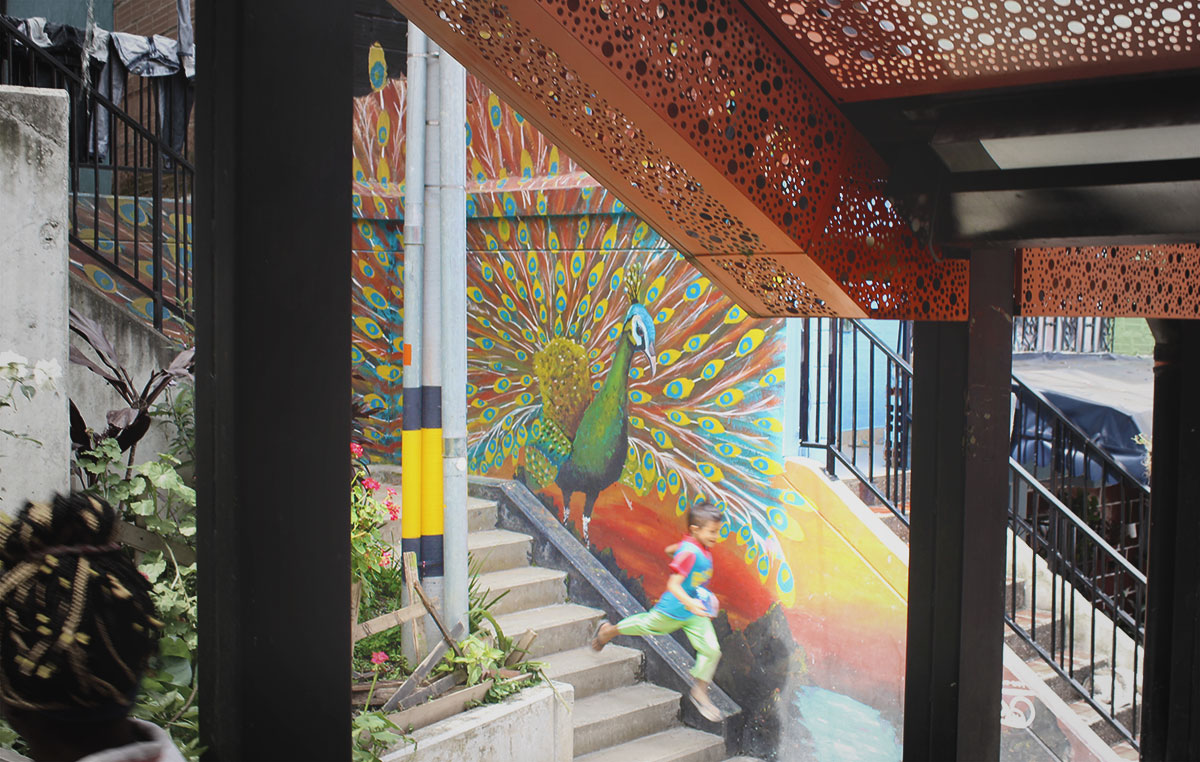 Today, with the help of the Colombian government, this area has been blessed with peace and restoration. As an attempt to heal this area of its violent history and reputation, graffiti artists have been hired to paint the walls of the Comuna to inspire hope and forward thinking in the youth growing up there. We were even lucky enough to meet the artist of the mural in the pic above, Chota.